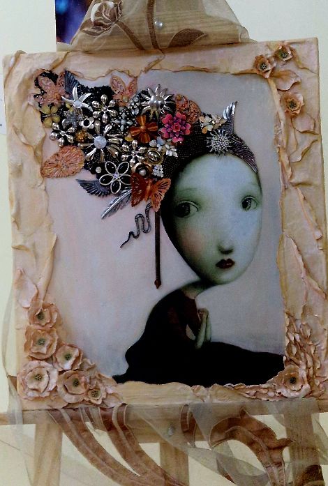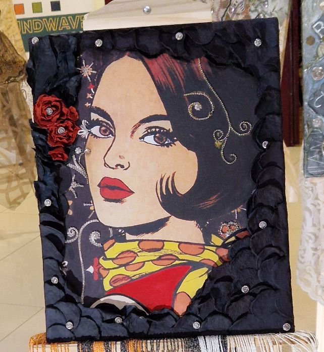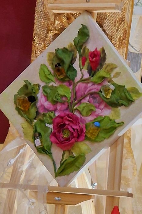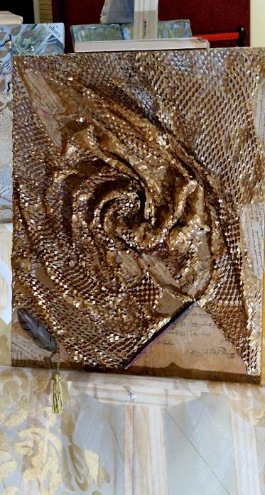Dici gioielli ed immagini collane, bracciali, monili, fregi ornamentali, oggettistica varia e via continuando in oro, argento e platino. Beni– tesoro da sfoggiare, magari con qualche assillo e preoccupazione, in particolari circostanze, ma da riporre in custodie di massima sicurezza, una volta conclusa l’esibizione più o meno ostentata, con la compiuta soddisfazione di sé. Per Mu \ Te, e non ti puoi affatto sbagliare, i gioielli autentici e certificati in assoluto sono, invece, le leggiadre e ariose composizioni d ’arte in cartapesta, la tipica carta– rifiuto riciclata, quale più povera non … esiste, e che, allineate su due file, hanno fatto mostra di sé nell’accogliente atrio della struttura di via Marconi. Un bel saggio di opere visive di recente produzione, firmate da Cettina Prezioso, a tema vario, con la consueta eleganza stilistica calibrata nell’ utilizzo incisivo e intenso delle tonalità coloristiche, dal fiammeggiante rosso al vivido azzurro.