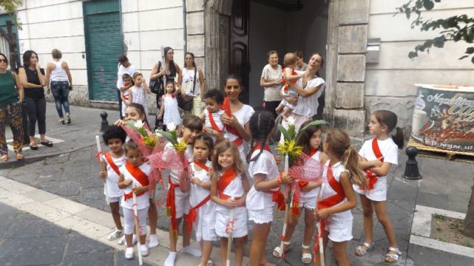 E’ il 3 agosto e il popolo di  Baiano è in festa per celebrare degnamente il Santo Protettore. Stamattina, alle ore nove, una folla emozionata ha atteso in piazza l’arrivo dei “battenti”. Nel loro tradizionale costume bianco con fascia rossa e immagine del Santo sul cuore (e dentro al cuore), la schiera infinita di devoti, di ogni età, si fa largo tra due ali di folla in una atmosfera gioiosa. I caratteristici e semplici squilli di tromba, che di tanto in tanto si levano dalla schiera dei battenti, sono dei suoni antichi, che vengono dal passato, suoni della memoria, che si fanno breccia nei cuori dei presenti, soprattutto delle vecchie generazioni. I “battenti” incarnano i sentimenti di tutti, perché non c’è cittadino baianese che non si senta partecipe, anche se non si sottopone a questo  sacrificio fisico. Un commovente spettacolo di religiosità popolare, dunque, il cui significato si legge nel libro: “Baiano”, di Orazio Bocciero e Antonio Vecchione, pubblicato quasi venti anni fa.