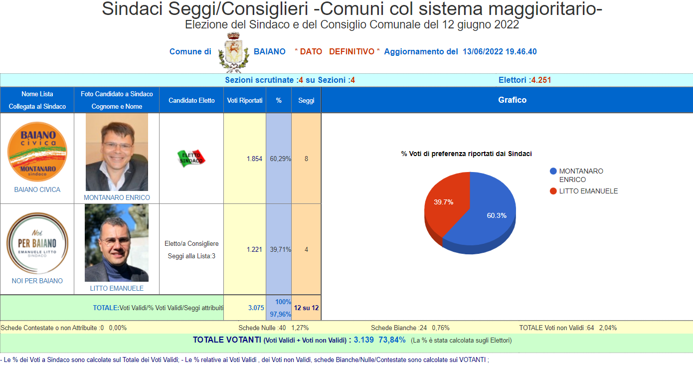 BAIANO. I dati definitivi dello spoglio. Montanaro vince su Litto con ampio margine 13/06/2022 binews.it ATTUALITA', BAIANO, POLITICA 0 La vittoria di Enrico Montanaro è più schiacciante delle previsioni, il sindaco uscente viene riconfermato alla guida del paese con un distacco dagli avversari di 633 voti.