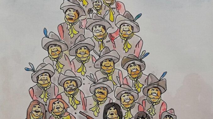 Tutti in viaggio nella stessa direzione: compatti, uniti, stretti, gioiosi nel percorso, tra canti, balli e spari, con uno straordinario carico d’energia che si potenzia con la partecipazione di ognuno.