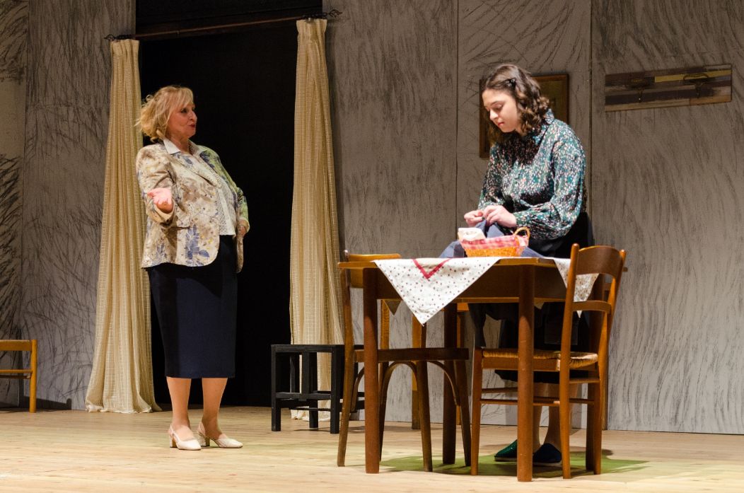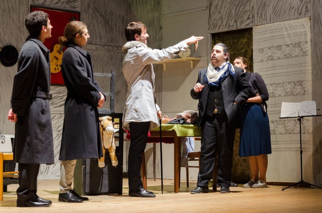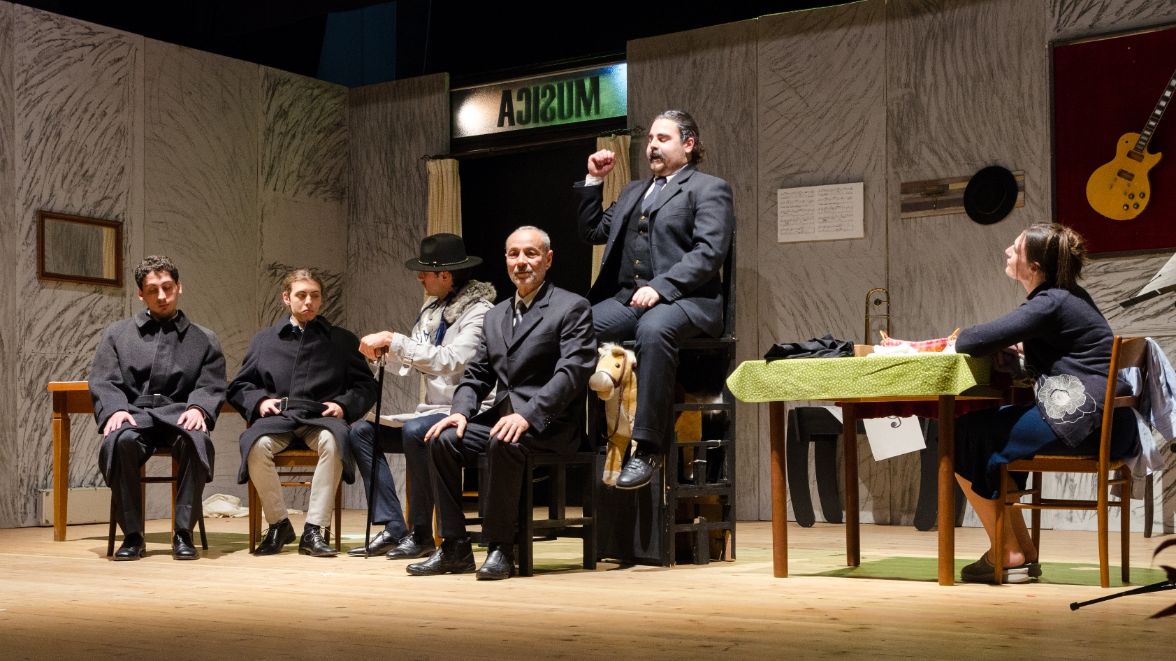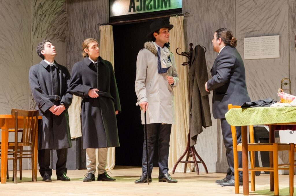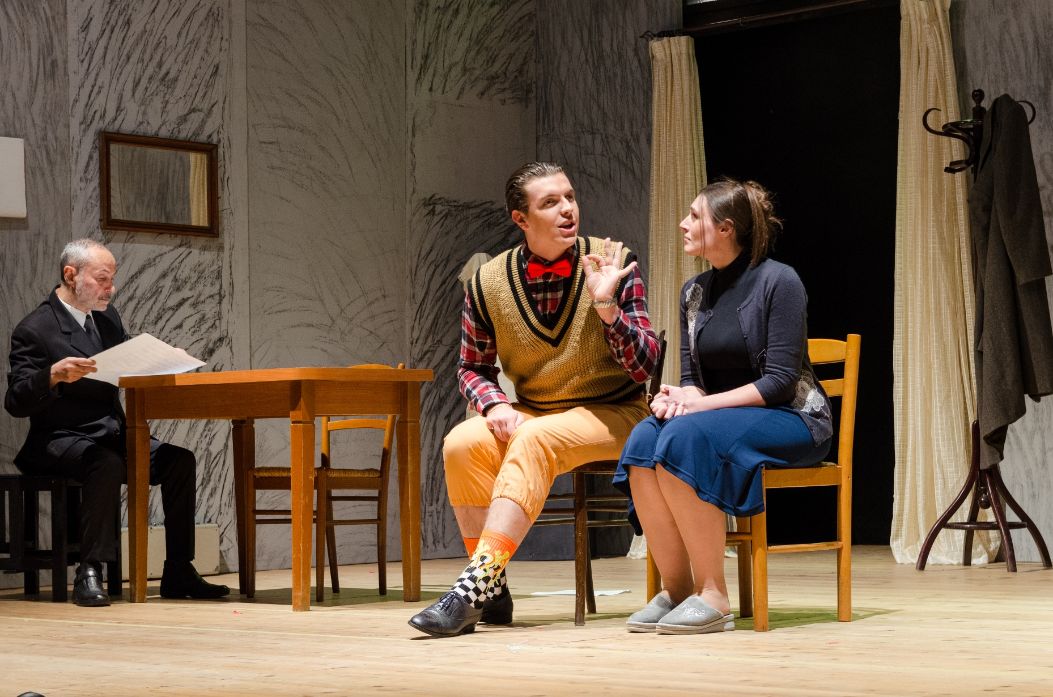Una doppia e talentuosa recitazione, quella esibita da Mateo Monteforte e Leandro Marino, che si ritrova con incisiva verve in Matteo Mascolo, sia per dare vita a Luigi, fratello di Alfredo Fioretti, nel Maestro di trombone, e sia in ‘Zi Vicienz’ scherza e spazza, animando il personaggio di ‘ On Giovanni ‘O cagna cavalli, il creditore che da tempo esige da Pascuttella il saldo dei conti, ma inutilmente. Ed è il Pascuttella che, mentre corteggia … e si fa sedurre da donna Stella, è messo, però, alle dure strette della severa e linguacciuta moglie che lo incenerisce, ogni qual volta gli rinfaccia i debiti che mai onora, chiamata la Diavola, interpretata con furente e calda passione dalla perspicace Pasqualina Candela. Un percorso, quello della doppia recitazione, in cui si incontra Carlo Acierno, il Giovanni del Maestro di trombone, e lo Spazzino–2 in scena per ‘Zi Vicienz’, per chiudere il cerchio con il sorprendente Francesco Candela, che interpreta l’Attilio incaricato del controllo su Alfredo Fioretti, e il Nicola La Croce, impiegato pubblico addetto ai conti correnti postali, che aspira a sposare Rosina, interpretata da Giovanna Picciocchi, restata orfana dei genitori e che vive nel basso di ‘Zi Vicienz’ Esposito e Donna Stella.