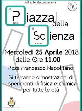 L’Associazione di Promozione Sociale Per Bacco 2.0 organizza l’evento “Piazza della Scienza”, durante il quale si terranno dimostrazioni di esperimenti di fisica e chimica per tutte le età. Semplicità, divertimento e voglia di stare insieme sono le parole chiave. I ragazzi vi aspettano in Piazza F. Napolitano a Baiano (AV) mercoledì 25 aprile. Non mancate! Per essere sempre aggiornati seguite i ragazzi su Fb ed Instagram: