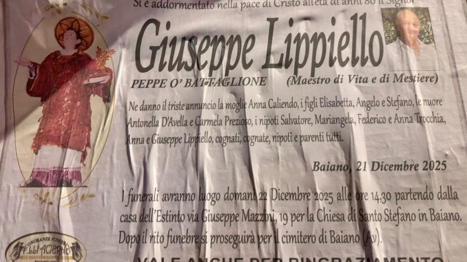 I funerali si svolgeranno domani, 22 dicembre 2025, alle ore 14.30, partendo dalla casa dell’estinto in via Giuseppe Mazzini n. 19 per la Chiesa di Santo Stefano in Baiano. Al termine della celebrazione religiosa, la salma proseguirà per il cimitero di Baiano (AV).