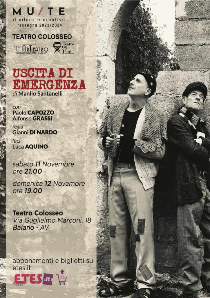 Le date previste per la rassegna sono: 11 e 12 novembre 2023 Paolo Capozzo e Alfonso Grassi in USCITA DI EMERGENZA di Manlio Santanelli
