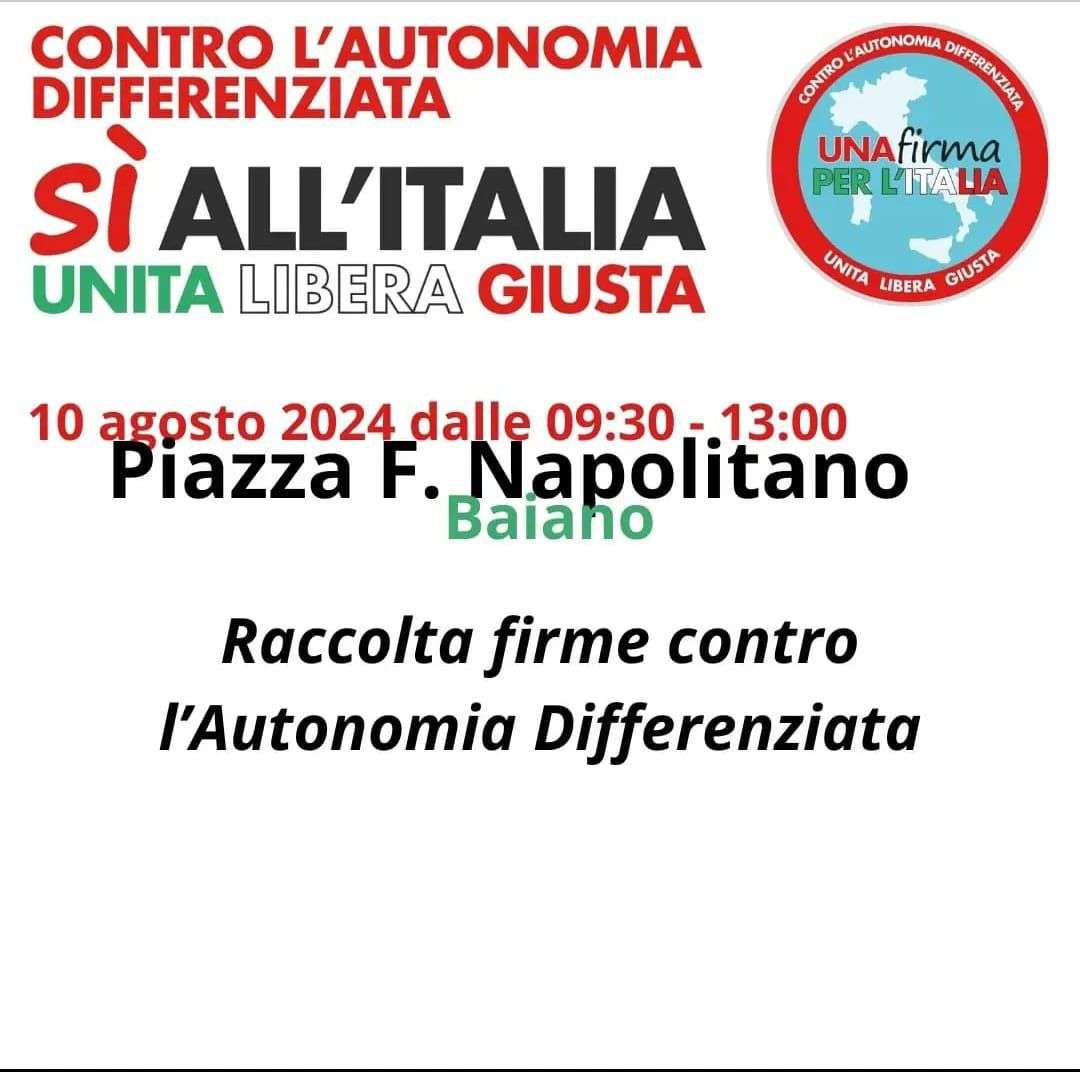 Oggi, 10 agosto 2024, a Baiano, la CGIL organizza una raccolta firme contro l’Autonomia Differenziata. L’evento si terrà in Piazza F. Napolitano dalle 09:30 alle 13:00 e fa parte di una campagna nazionale per opporsi a una riforma che potrebbe accentuare le disuguaglianze tra le regioni italiane. Con lo slogan “Sì all’Italia Unita, Libera, Giusta”, la CGIL mira a mobilitare i cittadini per preservare l’unità del paese e garantire uguali diritti per tutti, indipendentemente dalla regione di residenza.