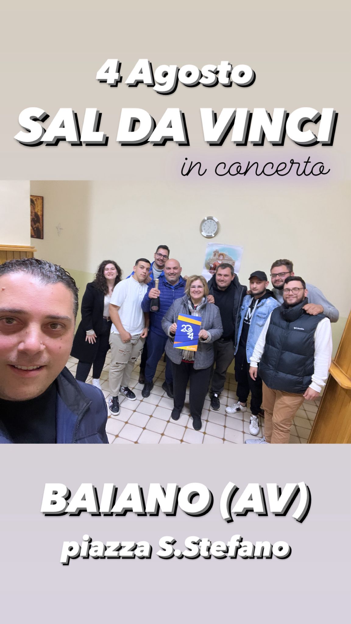 Nonostante il successo internazionale, Sal Da Vinci rimane radicato alle sue radici napoletane. È quindi con grande entusiasmo che annunciamo la sua prossima esibizione a Baiano il 4 agosto 2024 in piazza Napolitano, in occasione della festa patronale di Santo Stefano. Questo evento, scelto dal Comitato Festa insieme a Stefano Scafuri di Azzurra Spettacoli, promette di essere un’esperienza straordinaria per tutti i fan di Sal Da Vinci e per gli amanti della musica italiana in generale.