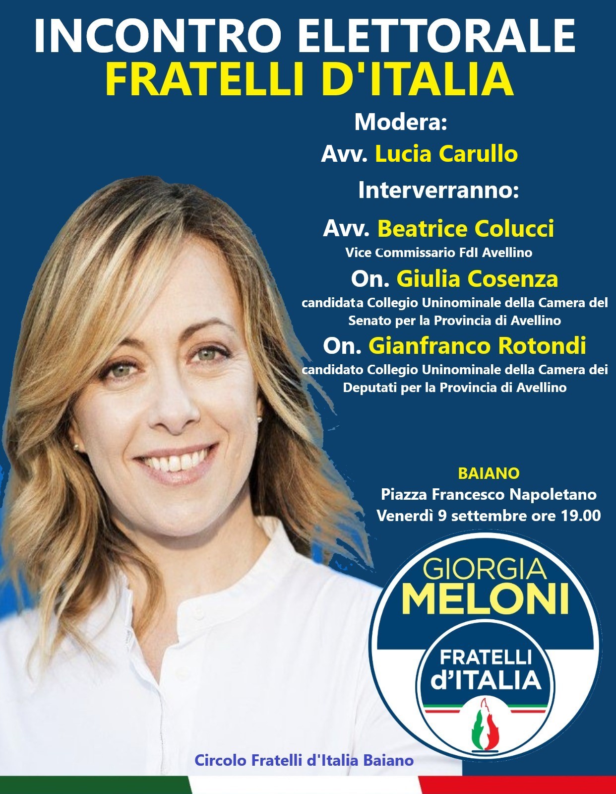 Il Circolo Fratelli d’Italia Baianese e Vallo di Lauro ha il piacere di invitare tutti gli elettori, questa sera, venerdì 9 settembre, alle ore 19 in piazza a Baiano, per un incontro elettorale con l’on. Gianfranco Rotondi candidato alla Camera e con l’on. Giulia Cosenza candidata al Senato. Modererà l’avv. Lucia Carullo ed interverrà l’avv. Beatrice Colucci.