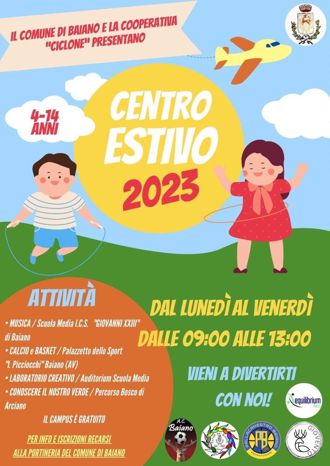 Il comune di Baiano presenta il Campus Estivo 2023 per i bambini e i ragazzi in età compresa tra i 4 e i 14 anni. Quest’anno è previsto anche un PROGETTO di INCLUSIONE per i bambini super speciali.
