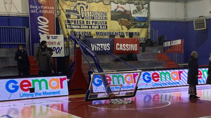 “Il match valido per il diciottesimo turno del campionato di #SerieB #OldWildWest tra Cassino e Salerno viene sospeso sul parziale di 36-44 ad un minuto e trentanove secondi dall’intervallo lungo dopo una schiacciata di Sylvere Bryan e l’immediata rottura della struttura del canestro precipitata sullo stesso Bryan. Il giocatore – dopo attimi di spavento da parte di tutti i presenti al #PalaVirtus – si è rialzato assistito dai sanitari ed è stato immediatamente condotto in ospedale per tutti gli accertamenti del caso.”