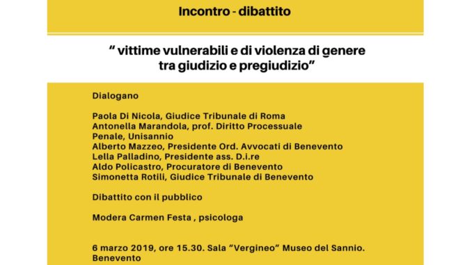 L’incontro dibattito “Vittime vulnerabili e di violenza di genere tra giudizio e pregiudizio” si svolgerà nella bella cornice della sala Vergineo del Museo del Sannio, vedrà la presenza di figure che a vario titolo si occupano di giudizio e pregiudizio, sul tema dialogheranno, infatti, tra loro e con il pubblico: Antonella Marandola, professoressa di diritto processuale penale dell’Unisannio, Alberto Mazzeo, presidente dell’Ordine degli Avvocati di Benevento, Lella Palladino, presidente dell’associazione D.i.r.e., Aldo Policastro, Procuratore della Repubblica di Benevento, Simonetta Rotili, Giudice del Tribunale di Benevento. Sarà presente anche l’autrice del libro “La mia parola contro la sua”, la Giudice Paola Di Nicola che da tempo si sta dedicando alla ricaduta dei pregiudizi e degli stereotipi di genere, in particolare in ambito giudiziario.