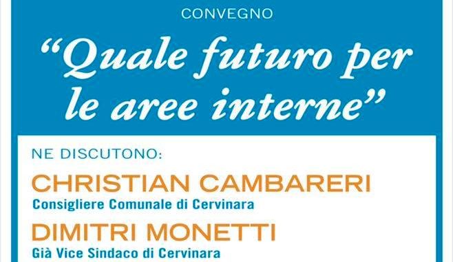 Dopo il rinvio dello scorso 22 dicembre a causa delle forti piogge e dell’alluvione, il prossimo 10 gennaio alle ore 18 a Cervinara ci sarà un convegno dedicato alle aree interne dell’Irpinia e del Sannio. L’incontro è in programma presso l’aula consiliare del Comune di Cervinara ed è organizzato dal consigliere comunale Christian Cambareri. Parteciperanno il presidente della Provincia di Avellino, Domenico Biancardi, il leader dell’associazione Nord-Sud, professor Severino Nappi e il senatore della Lega Ugo Grassi.