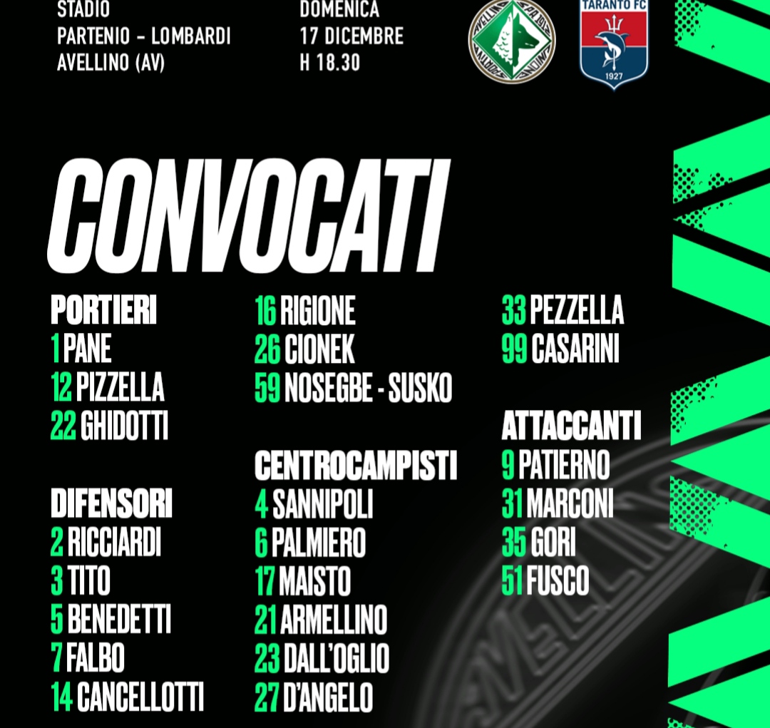 In vista del match tra Avellino e Taranto, valido per la diciottesima giornata del campionato di serie C Now, girone C, mister Michele Pazienza ha diramato la seguente lista di convocati: