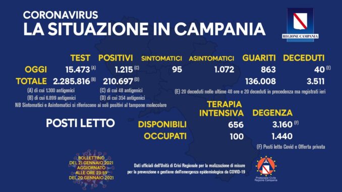 Positivi del giorno: 1.215 (di cui 48 casi identificati da test antigenici rapidi)