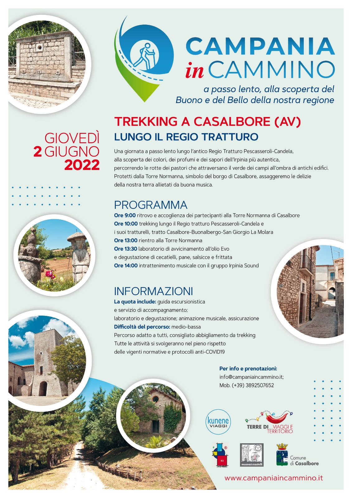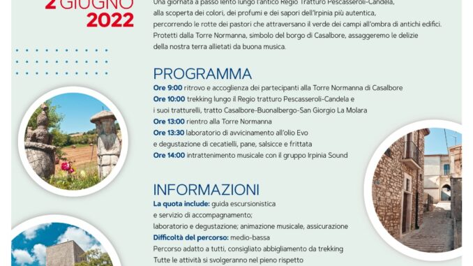 Dopo il successo del primo evento promosso dal nuovo format turistico “Campania in Cammino”, ospitato nell’affascinante cornice dei Campi Flegrei, il progetto prosegue con una nuova tappa, in programma il due giugno, questa volta in provincia di Avellino. Protagonista sarà l’antico Regio Tratturo Pescasseroli-Candela e i suoi tratturelli compresi nel tratto che abbraccia i borghi di Casalbore, Buonalbergo e San Giorgio La Molara. Una giornata all’insegna della scoperta dei colori, dei profumi e dei sapori dell’Irpinia più autentica, percorrendo le rotte dei pastori che attraversano il verde dei campi, all’ombra di antichi edifici. Protetti dalla mole della Torre Normanna di Casalbore simbolo del borgo antico, i partecipanti all’evento assaggeranno le delizie locali accompagnati da buona musica. L’evento si svolgerà, infatti, sempre secondo il format inaugurato dal progetto “Campania in Cammino”, che comprende una passeggiata di trekking urbano e/o extra urbano, abbinata a degustazioni di prodotti e piatti tipici e momenti di spettacolo (musica o rappresentazioni teatrali). A Casalbore, dove comincerà e terminerà il percorso, sarà possibile degustare l’olio Evo tipico del posto, insieme a cecatielli, salsicce e frittata. Il tutto allietato dalla musicale del gruppo Irpinia Sound. Il tutto è prenotabile dalla piattaforma digitale www.campaniaincammino.it. Campania in Cammino è un progetto di valorizzazione e promozione della regione Campania attraverso la creazione di esperienze outdoor lungo i cammini presenti sui territori delle sue provincie. La Via Appia, la Via Francigena, il Sentiero degli Dei e tutte le antiche vie della transumanza con i tanti tratturi e tratturelli percorsi da secoli quali preziose vie di collegamento, diventano oggi nuovi veicoli di scoperta e meraviglia, pronti ad ospitare le nuove forme di turismo che, nell’epoca contemporanea, vanno sempre più sviluppandosi. “Campania in Cammino” ha l’ambizioso obiettivo di mettere a sistema tale preziosa risorsa, attraverso la creazione di una piattaforma digitale pensata per favorire l’incontro tra la domanda e l’offerta di tutte le forme di turismo outdoor. All’interno della piattaforma digitale sarà possibile scegliere tra itinerari studiati in base alle esigenze dei target di riferimento, siano essi stranieri o italiani. E ovviamente sarà anche possibile partecipare ad iniziative originali e autentiche, pensate per favorire l’approccio al turismo del cammino da parte dell’utenza domestica, favorendo così lo sviluppo del turismo di prossimità. Proprio come l’evento in programma il due giugno. Il progetto è promosso da Kunene Viaggi, in collaborazione con “Terre di…viaggi e territorio”, e si avvale della consulenza artistica di Disco Service Musicheria.