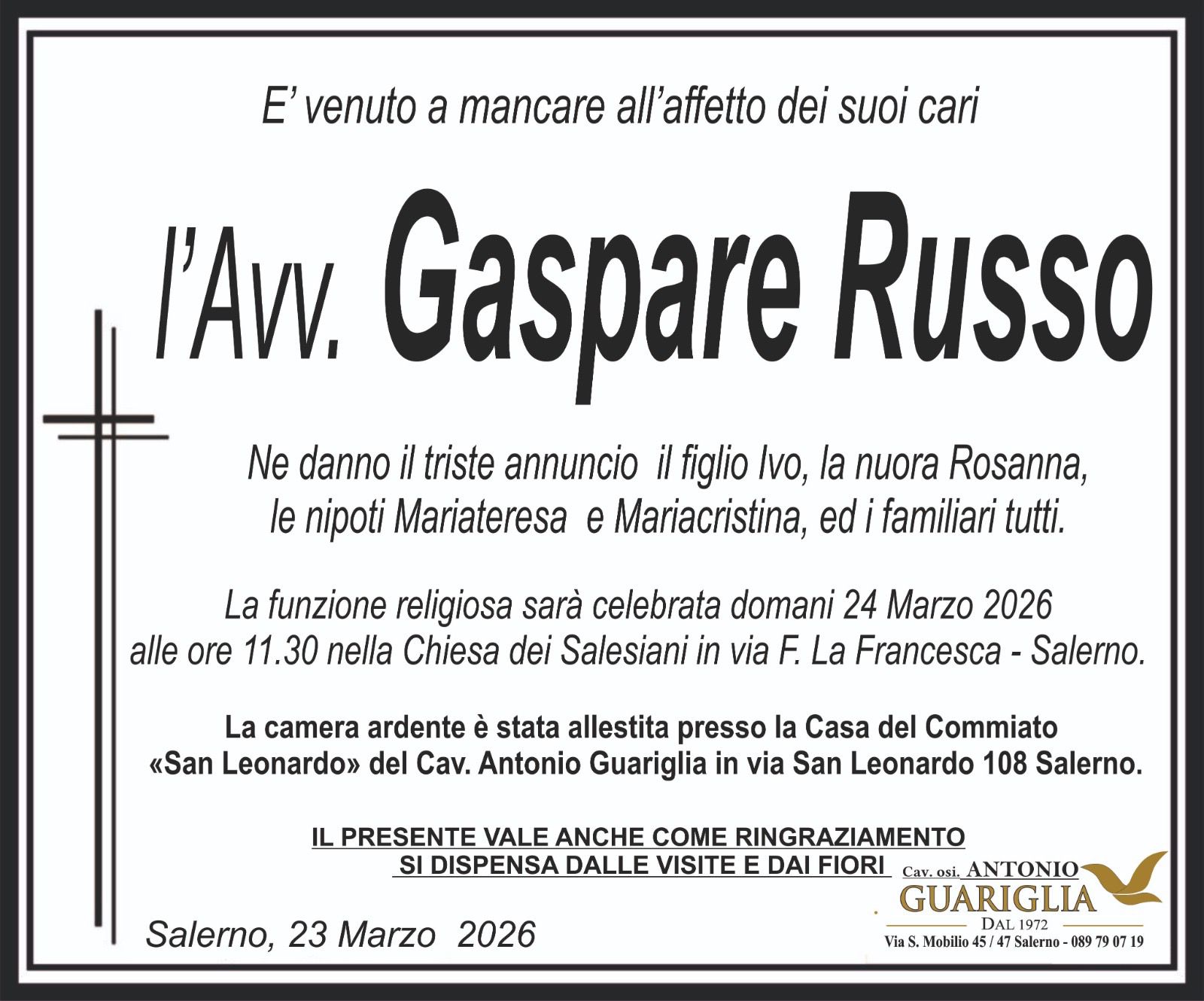 I funerali saranno celebrati domani, martedì 24 marzo, alle ore 11.30, presso la Chiesa dei Salesiani. La camera ardente è stata allestita nella Casa del Commiato “San Leonardo”. Con la sua scomparsa si chiude un capitolo importante della storia politica campana.