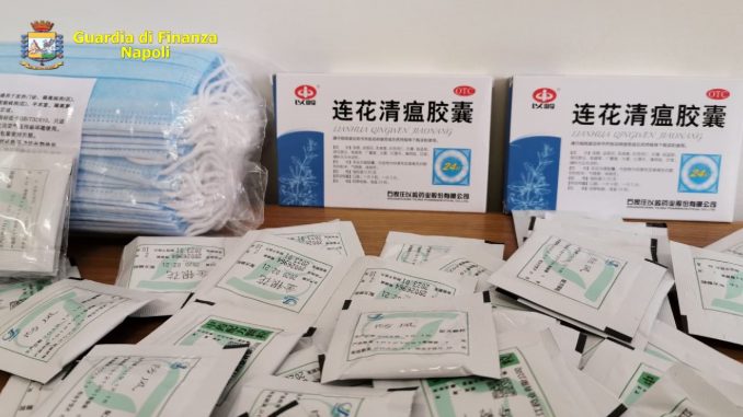 Il Comando Provinciale della Guardia di Finanza di Napoli ha sequestrato nel quartiere Ponticelli oltre 24.000 mascherine sulle quali era impresso il falso marchio “CE” e 5.000 confezioni di farmaci provenienti dalla Cina, “spacciati” come anti-coronavirus e privi di qualsiasi autorizzazione al commercio.