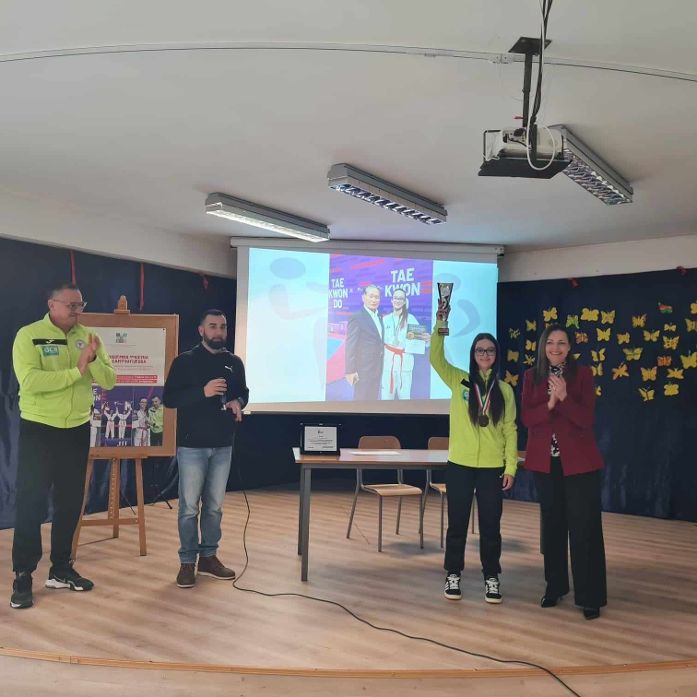 La comunità scolastica dell’IC Aurigemma di Monteforte ha premiato la campionessa di taekwondo Rosa Giannelli, studentessa della 3A della scuola secondaria di primo grado, classificatasi terza ai campionati italiani, nella categoria cintura rossa. Questa mattina nell’auditorium dell’istituto la cerimonia alla presenza del delegato provinciale Coni Peppino Saviano, dei coach della società sportiva dilettantistica irpina di taekwondo Rocco Giannelli e Luigi Saldutto e degli studenti delle classi terze. A fare gli onori di casa la dirigente scolastica Filomena Colella e il docente di scienze motorie Roberto Colella. A portare I propri saluti gli assessori al Comune di Monteforte Lia Vitale e Angelo Damiano. È stata la dirigente Colella a sottolineare il valore di cui si carica lo sport nella formazione delle nuove generazioni “lo sport è importantissimo per la vostra crescita, è uno strumento che può aiutarvi a diventare cittadini responsabili. E’ fondamentale, però, affiancare i successi nello sport all’impegno nello studio. Lo sport deve andare sempre di pari passo con la cultura, che sola rende liberi. Rosa deve essere un esempio da seguire per tutti voi”. Il professore Saviano ha ringraziato la dirigente scolastica per l’attenzione rivolta allo sport “che è sempre una palestra di vita. Non dobbiamo mai dimenticare che non conta quello che si fa ma come lo si fa. Fortunatamente, oggi, la pratica sportiva riveste un ruolo centrale anche all’interno della scuola, grazie ad una sinergia forte con i territori”. Quindi ha ricordato come fu il ministro irpino Francesco De Sanctis a introdurre l’insegnamento dell’educazione fisica delle scuole”. Giannelli e Saldutto hanno ripercorso la storia dell’antica arte sportiva del taekwondo, arrivata nel 1965 in Italia “Alle Olimpiadi del 2012 la prima medaglia conquistata dal nostro paese alle Olimpiadi, a cui è seguita nel 2020 la medaglia d’oro di Vito dell’Aquila che rappresenterà l’Italia anche ai prossimi giochi olimpici. Lo sport richiede tanti sacrifici ma i sacrifici sono sempre ricompensati. Rosa è stata l’unica atleta irpina a rappresentare i campionati italiani. Per la nostra società è stato un grande motivo di orgoglio”. Il professore Colella ha sottolineato come iniziative come queste siano importanti per offrire una vetrina a sport poco conosciuti come il taekwondo. Dagli assessori Vitale e Damiano l’incoraggiamento a Rosa a proseguire lungo la strada dell’impegno nello sport e nello studio. Quindi la consegna di una targa e di una coppa alla campionessa Rosa, visibilmente emozionata.