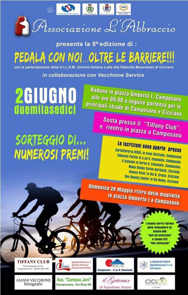 L’Associazione Abbraccio presenta la 5° edizione di “Pedala con noi……oltre le barriere!!!” che si svolgerà tra Camposano e Cicciano. Alle ore 9.00 è previsto il raduno dei ciclisti in Piazza Umberto I, definito come punto di partenza verso le principali strade di Camposano e Cicciano. L’Associazione potrà contare anche sulla valida collaborazione dell’ UILDM di Cicciano e Vecchione Service. Dopo il tour e la sosta presso il “Tiffany Club” ci sarà il rientro e il sorteggio di numerosi premi. Le iscrizioni sono aperte presso alcune cartolerie e tabacchi di Camposano e Cicciano.L’evento è importante e pone come obiettivi: la sensibilizzazione verso il problema delle barriere architettoniche e le azioni utili da intraprendere affinchè ci sia una risoluzione. L’Uildm di Cicciano è molto attiva nell’agro nolano e nel comprensorio avellano, difatti ha programmato in i vari comuni,con le associazioni locali, delle attività in grado di coinvolgere le istituzioni in modo concreto. (Michele Amato)