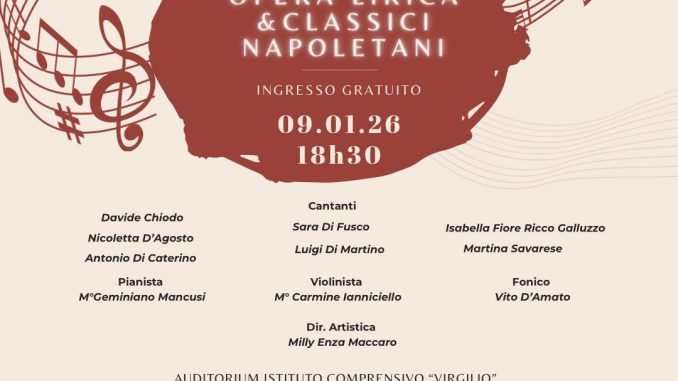 Una serata all’insegna della grande musica e delle emozioni è in programma a Camposano. Venerdì 9 gennaio 2026, con inizio alle ore 18.30, l’Auditorium dell’Istituto Comprensivo “Virgilio” (in via Rispoli 24) ospiterà il Concerto di Opera Lirica & Classici Napoletani, un evento a ingresso gratuito promosso con il patrocinio del Comune di Camposano.