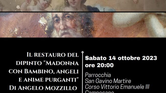 Sabato 14 ottobre 2023, nella chiesa di San Gavino Martire a Camposano, sarà presentato il restauro del quadro di Angelo Mozzillo dal titolo “Madonna con Bambino, angeli e anime purganti” del 1800.