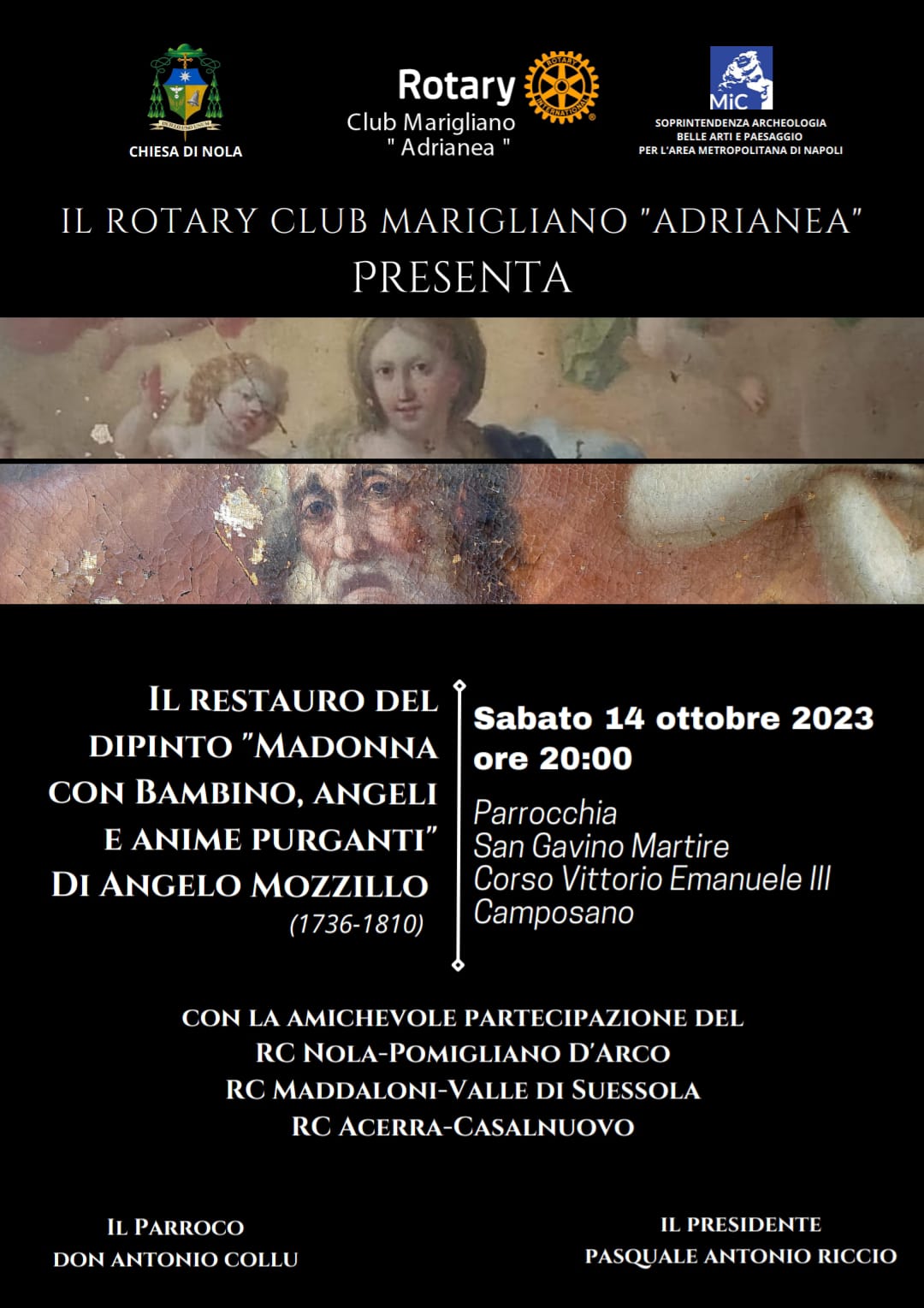 Alla serata saranno presenti autorità rotariane, i Presidenti dei Club partecipanti e loro soci, il Parroco di Camposano don Antonio Collu, rappresentanti della Curia di Nola, la Responsabile dell’ufficio Beni Culturali della Curia Tonia Solpietro, rappresentanti della Sovraintendenza, Domenico Corcione autore di studi e pubblicazioni su Angelo Mozzillo, la restauratrice Marilù Foglia e i ragazzi della compagnia teatrale.