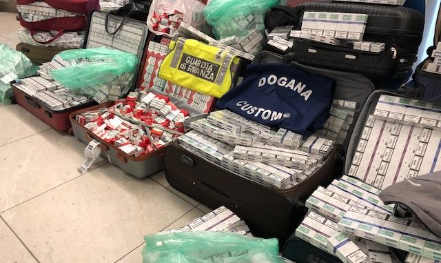 Nel quadro dell’intensificazione del dispositivo di contrasto ai traffici illeciti, i finanzieri della compagnia di Capodichino, congiuntamente a funzionari dell’Ufficio delle Dogane – S.O.T. Aeroporto Capodichino – hanno individuato all’interno dello scalo partenopeo 5 cittadini di origine ucraina che trasportavano nei rispettivi bagagli personali complessivi chilogrammi 161,18 di sigarette di contrabbando di varie marche. In particolare, i finanzieri della Compagnia di Capodichino, a seguito di attenta analisi di rischio effettuata sui nominativi delle liste passeggeri provenienti non solo da località sensibili, ma anche da aeroscali nazionali collocati in modo nevralgico per raggiungere mete internazionali, attenzionavano, tra i numerosi passeggeri in transito presso lo scalo aeroportuale campano, 5 cittadini ucraini appena giunti dalla capitale ucraina, Kiev. Quest’ultimi, dopo il ritiro dei bagagli, si apprestavano frettolosamente all’uscita ma venivano fermati dai militari per gli adempimenti di rito. Non fornendo convinte spiegazioni circa le motivazioni del transito e manifestando anomalo nervosismo nella circostanza, venivano sottoposti a controllo, riscontrando così la presenza, all’interno dei rispettivi bagagli, di complessivi kg 161,18 di sigarette di contrabbando. I 5 responsabili venivano denunciati alla competente Autorità Giudiziaria con l’accusa di contrabbando di t.l.e.. La lotta ai traffici illegali in genere ed il contrasto del contrabbando di sigarette, oltre a prevenire e reprimere altre forme più gravi di illegalità mira alla salvaguardia della salute dei cittadini