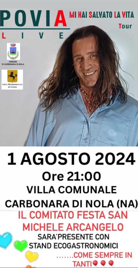 Il concerto di Povia è uno degli eventi più attesi dell’estate a Carbonara di Nola. L’artista, che ha raggiunto la notorietà con brani come “I bambini fanno ‘ooh…'” e “Vorrei avere il becco”, porterà sul palco della Villa Comunale una selezione dei suoi successi, regalando al pubblico una serata di musica ed emozioni.
