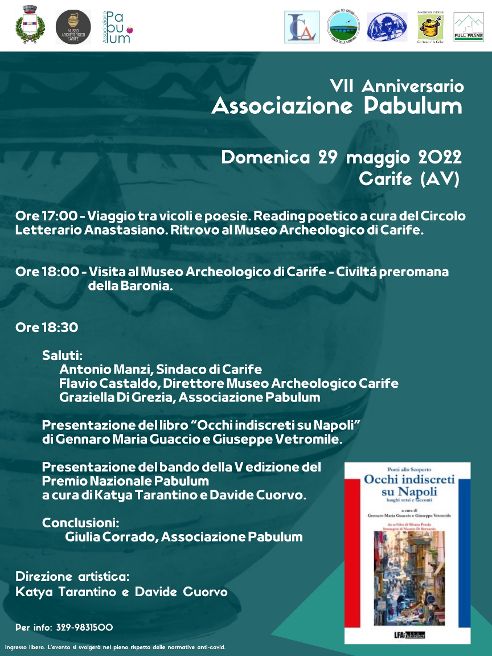 Il pomeriggio culturale inizia alle ore 17 con il reading poetico “viaggio tra vicoli e poesie” moderato da Giuseppe Vetromile. Alle ore 18 è prevista una visita al Museo Archologico di Carife. In seguito ai saluti di Antonio Manzi, Sindaco di Carife, Flavio Castaldo, Direttore Museo Archeologico di Carife e Graziella Di Grezia, socia fondatrice dell’Associazione Pabulum, si tiene la presentazione dell’antologia “Occhi indiscreti su Napoli” a cura del Circolo Letterario Anastasiano. L’antologia raccoglie brevi testi di narrativa e di poesia ispirati ad immagini, panorami, luoghi e personaggi della Napoli attuale. Gli Autori, in totale 26, si sono infatti riferiti, per i loro elaborati originali, ad altrettante foto della città, scattate da Nunzio Di Bernardo. Durante il pomeriggio culturale viene presentato, da Katya Tarantino e Davide Cuorvo, il bando della V edizione del Premio Nazionale Pabulum. È previsto l’intervento del dott. Antonio Limone, Direttore Generale dell’Istituto Zooprofilattico Sperimentale del Mezzogiorno e Presidente Onorario del Premio. L’iniziativa termina con i saluti di Giulia Corrado.