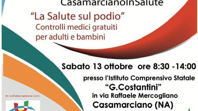 “La salute sul podio”: controlli medici gratuiti per adulti e bambini. A Casamarciano va in scena la prevenzione. L’iniziativa, promossa dall’amministrazione comunale guidata dal sindaco Andrea Manzi con l’assessore alla sanità Francesco Buono, si terrà sabato 13 ottobre nei locali dell’istituto comprensivo statale “G. Costantini” in via Raffaele Mercogliano. Dalle 8.30 alle 14.00 sarà possibile effettuare visite mediche gratuite negli ambulatori, attivi per l’occasione, di oculistica,  odontoiatria, cardiologia e otorinolaringoiatria.