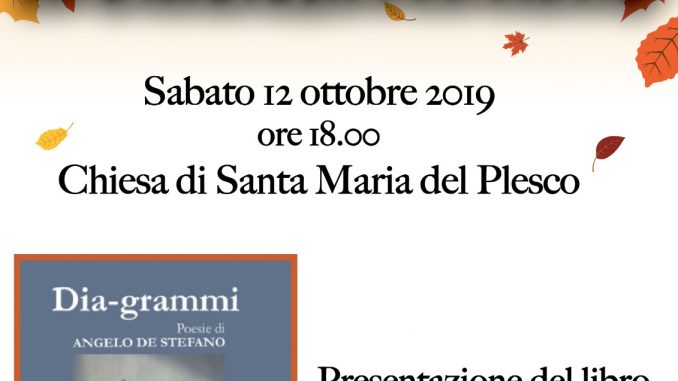“Dia-grammi” è il titolo della raccolta di poesia di Angelo De Stefano che sarà presentata domani, sabato 12 ottobre, a Casamarciano nella chiesa di Santa Maria del Plesco. L’appuntamento è per le ore 18.30. Al tavolo con l’autore Luigi Renzi, docente di lettere al liceo Albertini di Nola e Rosa Esca, dirigente scolastica dell’istituto comprensivo Quasimodo di Crispano. In scaletta anche la lettura di alcuni passi a cura dell’attore e cultore di teatro contemporaneo Gennaro De Stefano.