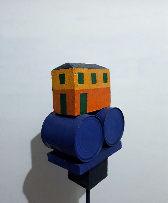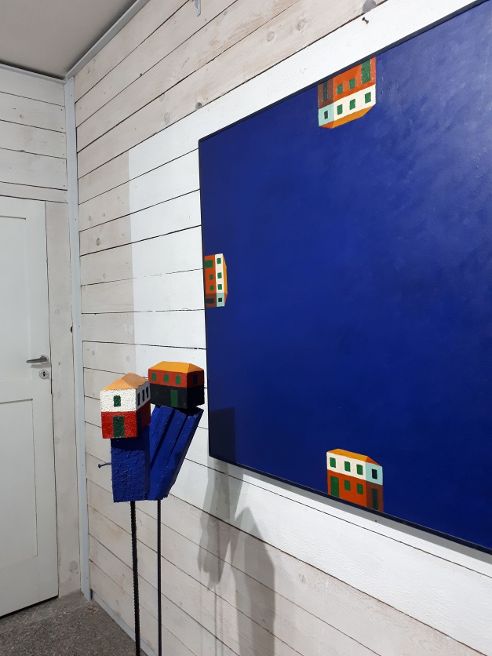 Il tema della mostra riguarda case in fila, associate, in coppia, angolate, oppositive d’ombra e di luci. Si tratta di case che emergono prepotenti e scompaiono nel mare verticale, oppure di case che fanno sognare nel verde, che fanno rollio e beccheggio, a rischio di andare a picco. Ci sono anche case che fioriscono su steli di ferro e si stagliano nello spazio estraneo su bidoni vuoti, per non affondare: tutte case sul mare.
