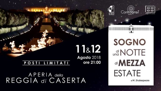 La compagnia Controtempo theatre e Illoco Teatro presentano l’11 e il 12 Agosto h 21 presso l’Aperia – ingresso in via Maria Cristina di Savoia – della Reggia di Caserta:  “Sogno di una notte di mezza estate” di W.Shakespeare con la regia di Roberto Andolfi e Annarita Colucci.