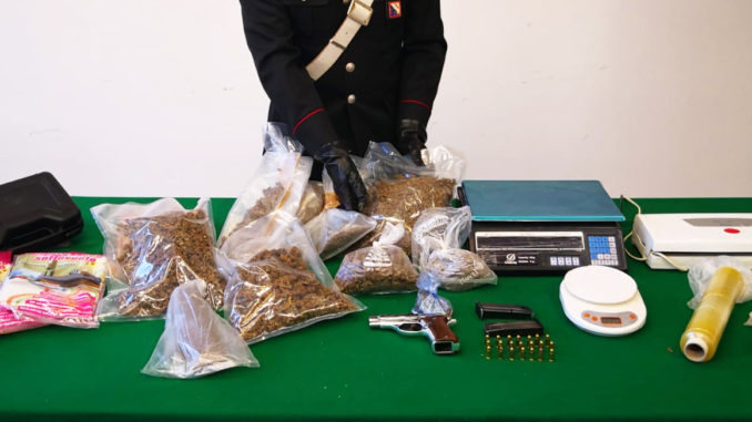 In questo periodo di controlli anti-contagio non sono passati inosservati  ai carabinieri della compagnia di Castellammare di Stabia i movimenti di due persone, zio e nipote. I  militari hanno arrestato per detenzione illegale di arma e munizionamento e per detenzione di droga a fini di spaccio G.S., 54enne del posto già noto alle forze dell’ordine e una ragazza 26enne incensurata. i due “frequentavano” spesso i loro box-auto e questo ha insospettito i carabinieri che hanno perquisito i due locali trovando una pistola Beretta cal. 7.65 con matricola abrasa e pronta a sparare, completa di due caricatori e 21 cartucce. sequestrata anche marijuana: in alcuni involucri di plastica occultati un chilo e mezzo di sostanza pronta alla vendita e in parte suddivisa in dosi, materiale per il confezionamento e un bilancino di precisione. I militari hanno esteso la perquisizione anche a Gragnano in un altro box di proprietà del 54enne e hanno trovato altri 160 grammi di marijuana, materiale per il confezionamento e 4 bilancini di precisone. Zio e nipote sono stati collocati agli arresti domiciliari a disposizione dell’autorità giudiziaria. L’arma sequestrata sarà sottoposta ad accertamenti per verificare il suo eventuale utilizzo in fatti di sangue.