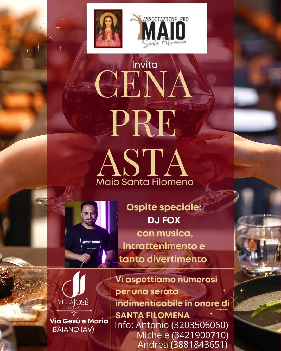 Organizzata dall’Associazione Pro Maio Santa Filomena, la serata rappresenta molto più di una cena: è un momento di condivisione autentica, in cui tradizione, fede e senso di appartenenza si intrecciano. Sedersi a tavola insieme significa riconoscersi parte di una storia comune, fatta di gesti tramandati, di valori custoditi e di una devozione che continua a vivere grazie all’impegno di tutta la comunità.