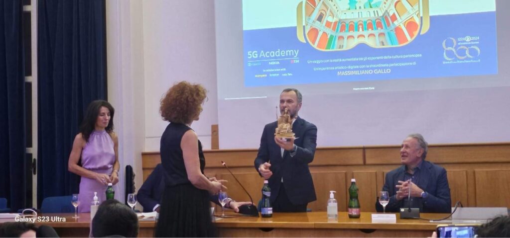 Continuano le affermazioni di Cettina Prezioso artista poliedrica e maestra nelle realizzazioni in cartapesta. È di sabato 14 ottobre la sua presenza alla cerimonia conclusiva del progetto di UNINA 5GAcademy 2023, con la realizzazione delle sculture consegnate a ospiti e partecipanti raffiguranti il fondatore dell’Università degli Studi di Napoli “ Federico II” per l’occasione dell’800 anniversario dell’Ateneo Napoletano. L’evento curato da un’altra eccellenza del nostro territorio, la Prof.ssa Antonia Maria Tulino, direttore scientifico dell’Academy . Con il progetto ReVivo realizzato dagli studenti della 5G Academy Postgraduate , lo “Stupor Mundi”, rivive ed interagisce con la voce e le sembianze dell’attore Massimiliano Gallo, un perfetto connubio di arte e tecnologie digitali. I progetti dell’Academy realizzati con la collaborazione di imprese del settore comunicazioni e del digitale arricchiscono la formazione tecnologica di neo laureati e professionisti nella prospettiva della “rivoluzione” digitale.Preparato con dovizia di particolari l’evento ha raccolto il plauso in primis del Rettore Matteo Lorito e le congratulazioni degli invitati. All’arte di Cettina Prezioso l’Academy di UNINA ha dedicato un videoclip realizzato nei giorni precedenti nell’atelier dell’artista.
