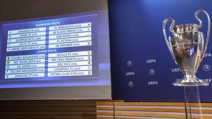 epa06124055 The group formations are shown on an electronic panel next to the Champions League trophy, after the drawing of the games for the Champions League 2017/18 Play-offs, at the UEFA headquarters in Nyon, Switzerland, 04 August 2017. EPA/SALVATORE DI NOLFI