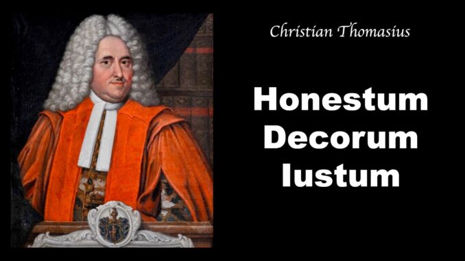 Thomasius ritiene opportuno introdurre un termine medio nella misura in cui la polarizzazione dei valori del male evitato e bene prodotto è riconoscibile agli estremi: se per distinguere due campi tra loro può essere sufficiente un parametro, per distinguerne tre c’è bisogno di almeno due parametri. Una della tre regole è una massima che considera la presenza dell’altro come un termine di paragone, ma che non prevede con l’altro nessuna interazione reale. In entrambi i casi Decorum e Iustum prevedono che la condotta sia interazione sociale ma anche volta a non pregiudicare la sfera degli interessi dell’altro. Ognuno lavora su se stesso, l’altro è solo un termine di paragone circa la tenuta da avere. (Il termine di paragone è il rapporto con gli altri).