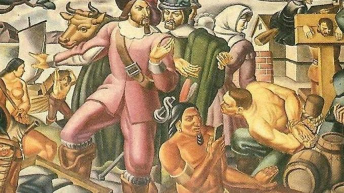 In questi giorni sul web si parla molto del dipinto realizzato da un artista italiano intitolato “Mr. Pynchon and the Settling of Springfield”. L’opera racconta l’incontro del 1630 fra due tribù del New England, i Nipmuc e i Pocumtuc, con i coloni inglesi che provenivano dal Massachusetts. Fra i particolari che attirano immediatamente l’attenzione ce n’è uno che sta facendo molto discutere. Un indiano rappresentato in primo piano stringe fra le mani uno strano oggetto. L’utensile in questione ha una forma rettangolare ed è piatto, mentre l’uomo lo utilizza muovendoci il pollice sopra. Che sia uno smartphone? Se lo sono chiesto moltissimi utenti, impressionati da quella che sembra essere una “predizione del futuro”.