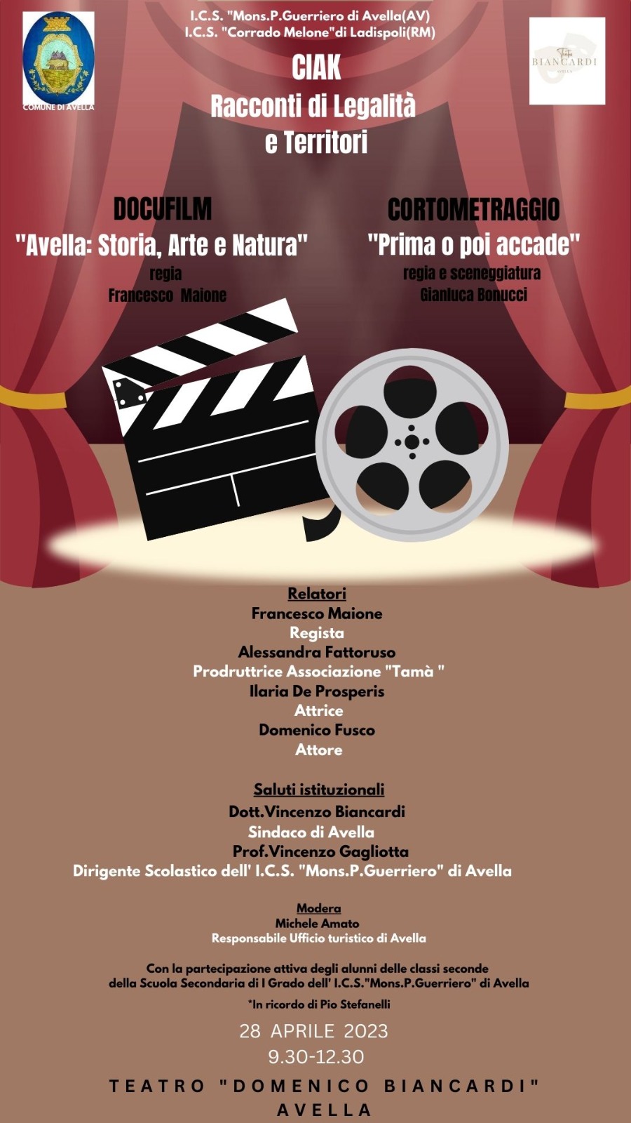 Nell’ambito dell’evento “Ciak, racconti di legalità e territori” il 28aprile 2023 alle ore 09:30 presso il teatro “Domenico Biancardi” di Avella, città d’arte della bassa Irpinia, nota per la presenza di importanti siti storici ed archeologici, si terrà la presentazione deldocufilm “Avella: storia, arte e natura” del regista Francesco Maione, dedicato al compianto Pio Stefanelli e del cortometraggio “Prima o poi accade”, con la regia e la sceneggiatura di Gianluca Bonucci e prodotto dall’associazione culturale “Tamà” di Alessandra Fattoruso. Saranno presenti all’evento il sindaco della cittadina irpina, il dottor Vincenzo Biancardi, il Dirigente Scolastico dell’I.C.S. “Mons.P.Guerriero”di Avella, prof. Vincenzo Gagliotta, il professore Domenico Fusco, concittadino Avellano e uno tra gli interpreti del cortometraggio, la protagonista dello stesso, la neo-attrice Ilaria De Prosperis e la produttrice Alessandra Fattoruso. Modererà Michele Amato, responsabile dell’ufficio turistico del comune di Avella. A dare il volto ai personaggi del cortometraggio “Prima o poi accade” sono stati i ragazzi dell’attuale 2 G e 2 E dell’I.C.S. “Corrado Melone”di Ladispoli, il D.S.prof. Riccardo Agresti, il già citato prof. Domenico Fusco, la prof.ssa Stefania Pascucci, la prof.ssaValentina Sforzini, l’imprenditore Giuseppe Patrocchi e il sindaco di Ladispoli, il dott. Alessandro Grando. “Prima o poi accade” affronta il delicato ed attualissimo tema del bullismo tra i banchi di scuola, con lo scopo di prevenirne e contrastarne gli esiti come i disturbi a livello affettivo, di identità, di autostima e di relazione gravi e pervasivi. Atteggiamenti consapevoli risultano infattiessenziali per la protezione delle vittime, da un lato, e per l’educazione alla socialità, dall’altro. Il cortometraggio, attraverso un linguaggio cinematografico semplice, ma coinvolgente e che invita alla riflessione, offre strumenti di immediata applicazioneper affrontare il fenomeno, quali l’autoriflessione e la consapevolezza. In sala saranno presenti gli alunni della scuola secondaria di I grado dell’istituto avellano che saranno chiamati a partecipare ad un dibattito sul tema trattato con i protagonisti del film e tutti gli intervenuti all’evento. Nella realizzazione del cortometraggio la troupe tecnica è stata composta dai ragazzi dell’istituto Cine-TV Roberto Rossellini. Al progetto ha partecipato anche il noto attore cinematografico Andrea De Rosa (Notte prima degli esami 1 e 2) e la ballerina e attrice Daniela Ricci. Agli inizi di Maggio è previsto l’inizio delle riprese del sequel di “Prima o poi accade”, che si intitolerà “Diversamente uguali” sempre per la regia e la sceneggiatura di Gianluca Bonucci e la produzione dell’associazione culturale Tamà di Alessandra Fattoruso, con la new entry del noto attore Vincenzo Della Corte.
