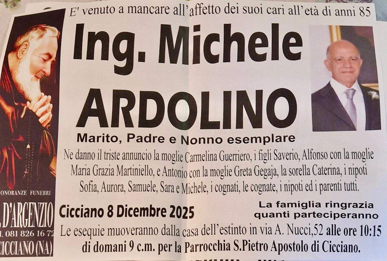 Cicciano piange la scomparsa dell’Ing. Michele Ardolino, venuto a mancare all’età di 85 anni. Figura stimata e punto di riferimento per la sua famiglia e per la comunità, Ardolino lascia un ricordo indelebile come marito, padre e nonno esemplare.