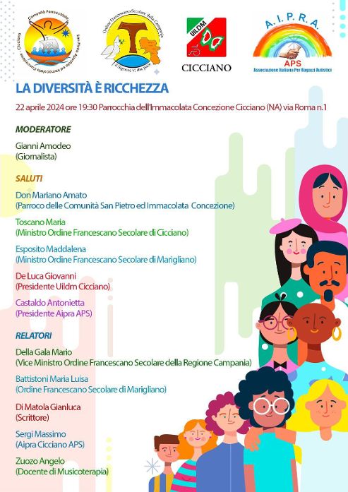 Sono state – queste – le linee di guida essenziali dell’incontro– scambio di esperienze vissute,- dopo l’indirizzo di saluto del parroco don Mariano Amato – svoltosi nella Chiesa dell’Immacolata Concezione, e coordinato da chi scrive queste righe, prendendo impulso dalla realtà operativa, costituitasi nel 2014 proprio in Cicciano, nell’ambito della Erezione canonica dell’ Ordine francescano secolare. Una realtà di condivisione e attiva partecipazione, che opera in stretta sinergia con le altre famiglie associazionistiche dello stesso Ordine – sono 14 – operanti nella Diocesi di Nola , prendendosi cura delle diversità, di cui sono portatori gli ammalati, i disabili fisici e psichici, le persone affette da autismo, dall’ asperger e dal ritardo generalizzato dello sviluppo psico–fisico.