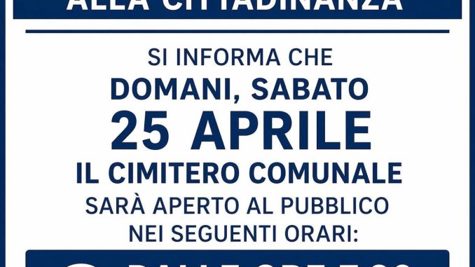 CIMITILE – Avviso importante per la cittadinanza in vista della giornata di sabato 25 aprile. Il Comune di Cimitile ha comunicato gli orari di apertura del cimitero comunale in occasione della festività.