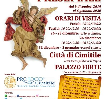 Dal 9 dicembre fino al 6 gennaio 2020 presso Palazzo Forte sito in Corso Umberto I° Cimitile (NA) , la Pro Loco con il Patrocinio della Regione Campania e del Comune di Cimitile e la collaborazione delle Associazioni Terra Mia e Gruppo Aido Nola-Cimitile ha organizzato una Mostra d’Arte Presepiale , nel periodo delle mostra, sarà allestita un’esposizione di opere d’Arte donate da artisti locali per una raccolta fondi per il Gruppo Aido Nola-Cimitile.