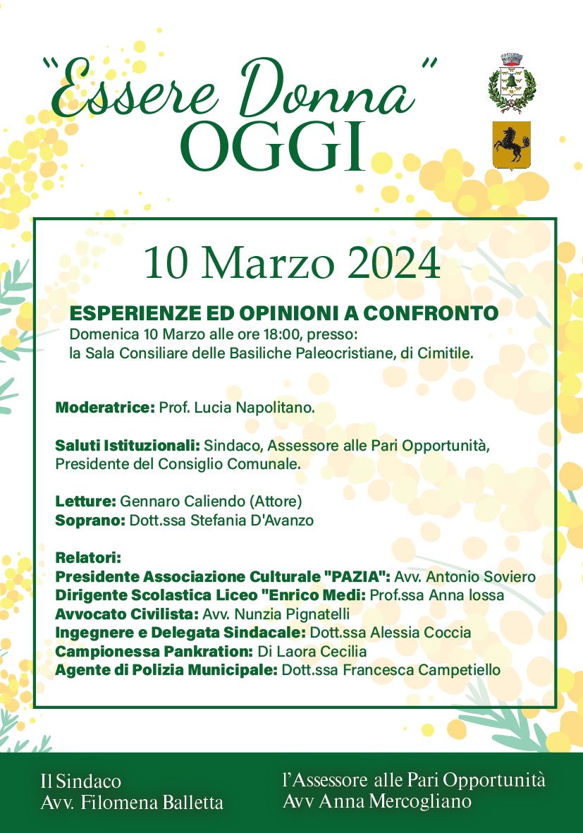 Domenica 10 Marzo 2024, nella splendida cornice della Sala Consiliare del Comune di Cimitile, attigua al complesso delle Basiliche, si è tenuto il convegno “Essere donna oggi”, promosso dall’Assessorato alle Pari Opportunità del Comune di Cimitile. Tra i relatori, l’Avv. Anna Mercogliano, Assessore alle Pari Opportunità che si è soffermata sui diritti delle donne in una società complessa che, per crescere in maniera omogenea, ha bisogno della sensibilità che solo le donne sanno mostrare nella quotidianità; la Dirigente Scolastica del Liceo “E. Medi di Cicciano” che ha evidenziato il ruolo della donna nella gestione della Scuola, un ruolo non solo manageriale, ma soprattutto pedagogico; l’Avv. Nunzia Pignatelli, Assessore ai Lavori pubblici del Comune delle Basiliche che ha evidenziato i progressi legislativi che sono stati fatti in Italia negli ultimi anni per tutelare la donna; l’agente di Polizia Municipale, Dott.ssa Francesca Campetiello che si è soffermata sul fatto che, da donna-vigile, si è inserita al meglio nel contesto cimilitese; l’Ingegnere e delegata Sindacale, Alessia Coccia che nello specifico, in relazione alla sua attività, ha evidenziato come nell’ambito delle aziende c’è una disparità non solo di trattamento economico, ma anche di ruoli dirigenziali tra uomini e donne; l’Avv. Antonio Soviero,