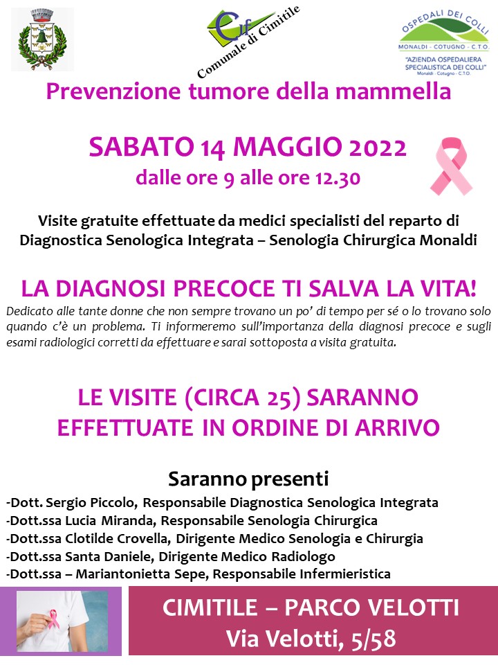 Sabato 14 maggio 2022 dalle ore 9 sarà possibile sottoporsi a visite senologiche gratuite eseguite dai medici dell’ospedale Monaldi. Le visite saranno circa 25 e saranno effettuate in ordine di arrivo alle donne dai 40 anni di età che abbiano eseguito una mammografia da portare con sé. La mattinata di prevenzione promossa dal CIF di Cimitile, è stata organizzata grazie alla collaborazione della nostra concittadina, dottoressa Maria Antonietta Sepe che ringraziamo per aver coinvolto i primari e i dirigenti medici dei reparti di Diagnostica e Senologia Chirurgica