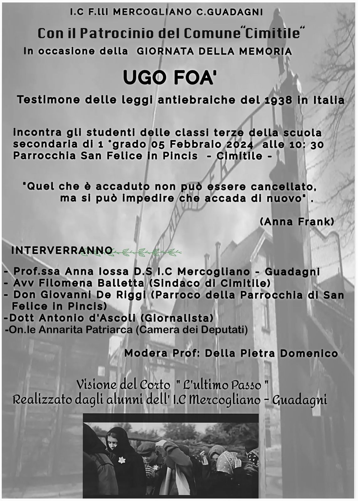 In occasione della Giornata della Memoria in ricordo di tutte le vittime della Shoah, l’I. C. MERCOGLIANO GUADAGNI di Cimitile con il patrocinio del Comune di Cimitile, organizza un incontro con Ugo Foà, nato a Napoli nel 1928 e residente a Roa, autore de “Il bambino che non poteva andare a scuola”, uscito nel 2021 per Manni editori, testimone delle leggi razziali in Italia del 1938 che porterà la sua testimonianza agli alunni e alle alunne delle classi terze della Scuola Secondaria di primo grado. L’attività rientra nell’ambito dei percorsi progettuali previsti dal Progetto d’Istituto