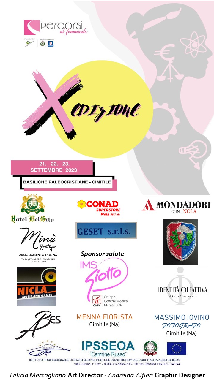 La realizzazione di questo evento, anche quest’anno, è stata possibile grazie all’impegno profuso dalle socie dell’associazione e alla sinergia costante con le istituzioni politiche e sociali della nostra realtà. Preme, altresì, sottolineare il sostegno dei numerosi sponsor locali che hanno sin da subito e, con entusiasmo, sposato la nostra idea. Inoltre, per la prima volta, in occasione della X edizione della nostra rassegna, abbiamo avuto l’onore di avere come nostro partner, in qualità di sponsor tecnico a livello nazionale, la società IMS GIOTTO, quale società produttrice di sistemi mammografici utilizzati per le attività di prevenzione e screening del tumore mammario che ha sostenuto con particolare attenzione, la tematica del nostro convegno dedicato alla salute e alla prevenzione del mondo femminile. Il nostro auspicio è quello di continuare a lavorare affinché questa rassegna, unica nel suo genere sul territorio, possa avere vita lunga e continuare ancora per lunghe edizioni.
