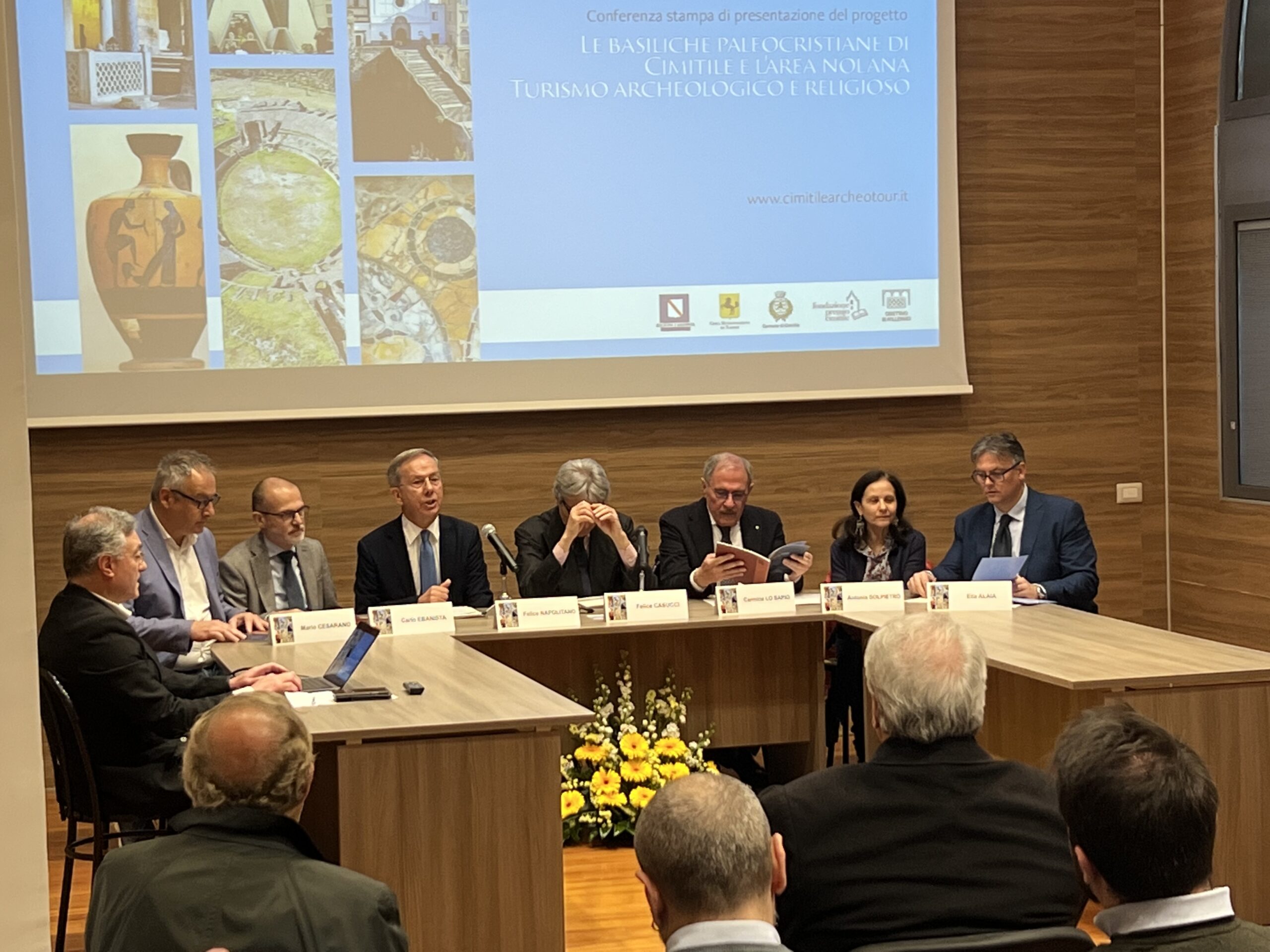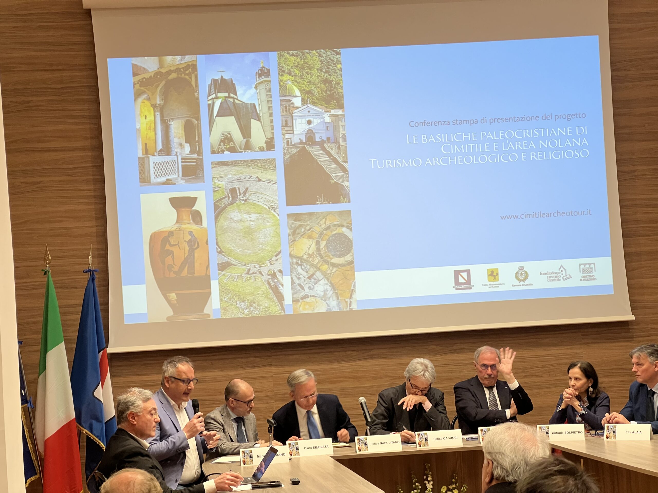 La Fondazione Premio Cimitile con i soci fondatori Regione Campania, Città Metropolitana di Napoli, Comune di Cimitile, Associazione Obiettivo III Millennio, ha presentato stamattina, nella sala auditorium del complesso basilicale di Cimitile, il progetto “Le basiliche paleocristiane di Cimitile e l’area Nolana. Turismo archeologico e religioso”.