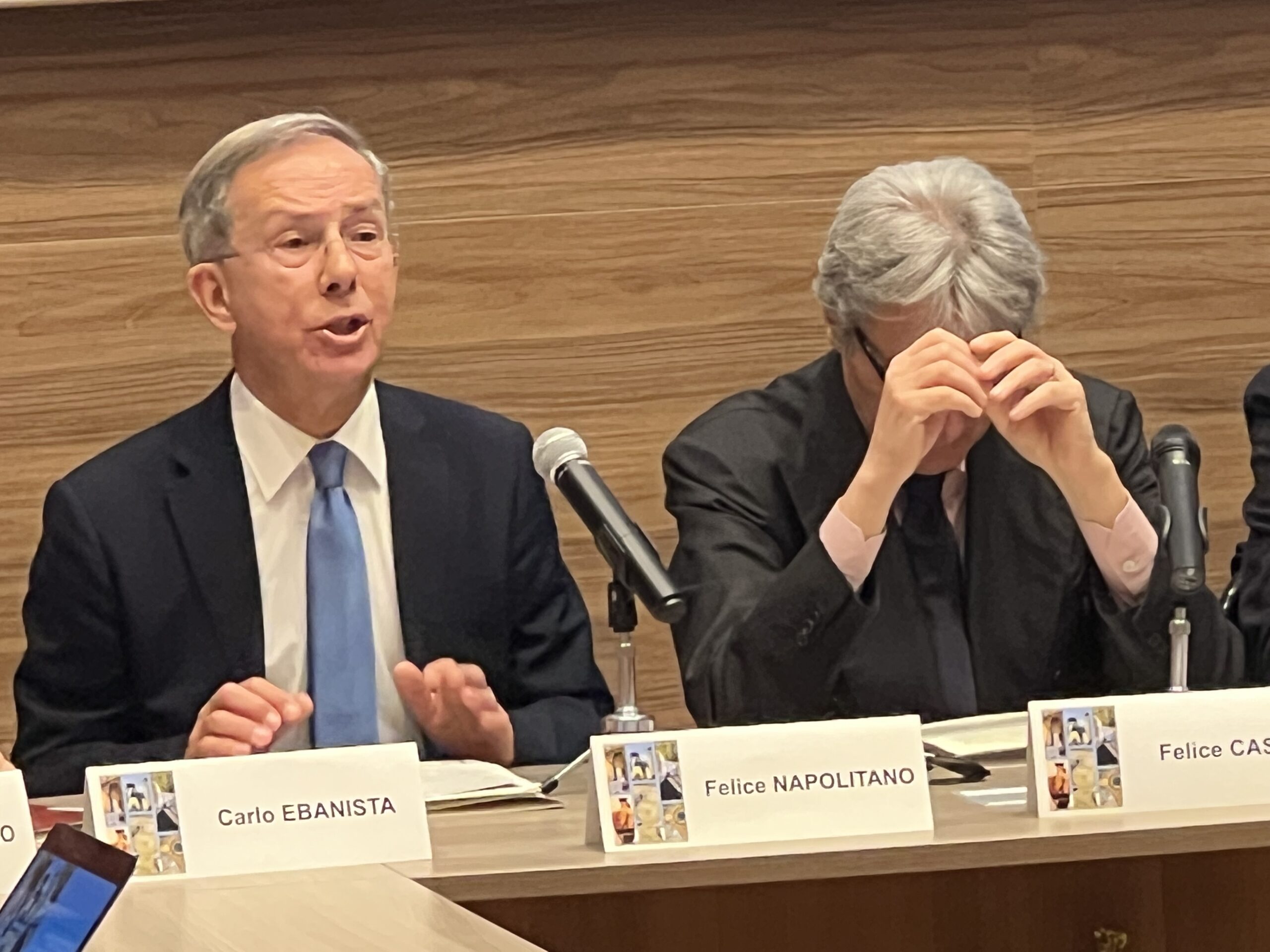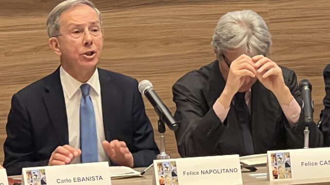 Al tavolo della conferenza stampa l’Assessore Regionale al Turismo e alla Semplificazione Amministrativa della Regione Campania, Felice Casucci, il Sindaco di Pompei e delegato al turismo della Città Metropolitana di Napoli, Carmine Lo Sapio e alcuni tra i componenti della cabina di regia Carlo Ebanista (docente all’Università degli Studi del Molise), Mario Cesarano (Archeologo e funzionario della Sovrintendenza), Antonia Solpietro (Direttrice Uffici Beni Culturali della Diocesi di Nola) ed Elia Alaia (presidente dell’associazione Obiettivo III Millennio).