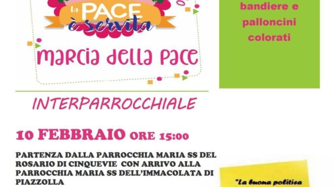 Anche le comunità parrocchiali di Cinquevie di Nola e Piazzolla si mettono in marcia per la Pace. Infatti domenica 10 febbraio è stata organizzata la festa e la marcia interparrocchiale della PACE promossa dall’ ACR delle rispettive parrocchie guidate da don Umberto Sorrentino e don Salvatore Luminelli. Per tale evento è stato coinvolto tutto l’istituto comprensivo Mameli diretto dalla dirigente dott.ssa Concetta De Crescenzo e la scuola di danza Stella Danzante di Antonella Liguori. Ci sarà la testimonianza dei padri missionari di Villaregia proprio sul tema LA PACE È SERVITA. Alla base della marcia ci sarà il messaggio di Papa Francesco per la 52esima giornata mondiale della PACE: LA BUONA POLITICA È A SERVIZIO DELLA PACE, beato il politico che ha un’alta consapevolezza e una profonda coscienza del suo ruolo… un messaggio che andrebbe letto soprattutto dai tanti candidati che anche questa volta si apprestano a servire Nola alle prossime elezioni comunali. L’appuntamento è per domenica 10 febbraio alle ore 15.00 con partenza dalla Parrocchia di Cinquevie e poi per via Napoli, via Costantinopoli fino alla Parrocchia di Piazzolla. Siamo tutti invitati a gridare il nostro SI alla PACE. Gennaro Ciccarelli